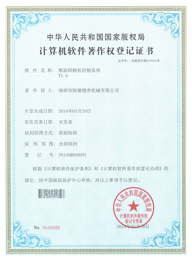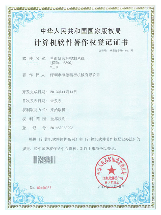 单头研磨机控制系统专利证书